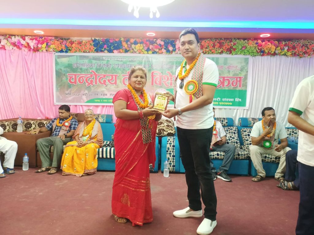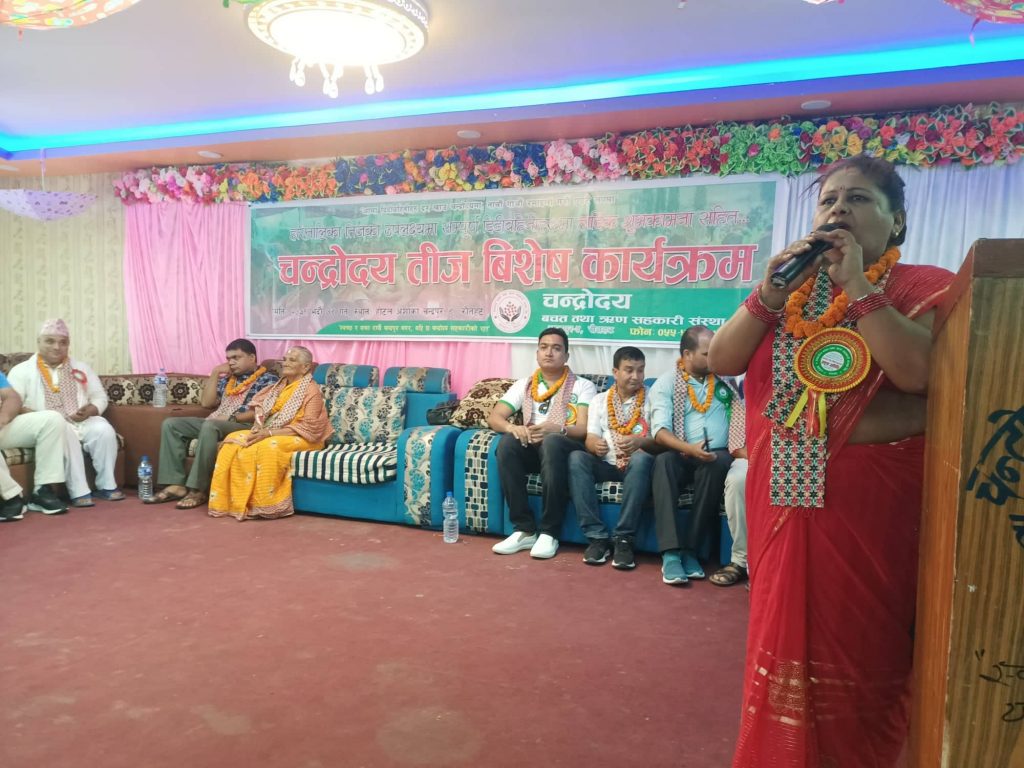चन्द्रपुर/ रौतहटको चन्द्रपुर ४ स्थित चन्द्रोदय बचत तथा ऋण सहकारी संस्था लिमिटेडले तीज बिषेश कार्यक्रम गरेको छ । सनिबार आफ्ना महिला शेयर सदस्यहरुलाई तीजको पुर्बसन्ध्यामा मनोरञ्जन एब्म दर खुवाएर कार्यक्रम गरिएको छ । सो कार्यक्रमका प्रमुख अतिथि रौतहट बचत तथा ऋण सहकारी संघकी अध्यक्ष देबकी नेपालले समाज रुपान्तरण र सामाजिक कार्यका साथै आफनो शेयर सदस्यको जीबन उकास्न चन्द्रोदय साकोसको भुमिका सराहनीय रहेको बताउनु भयो ।