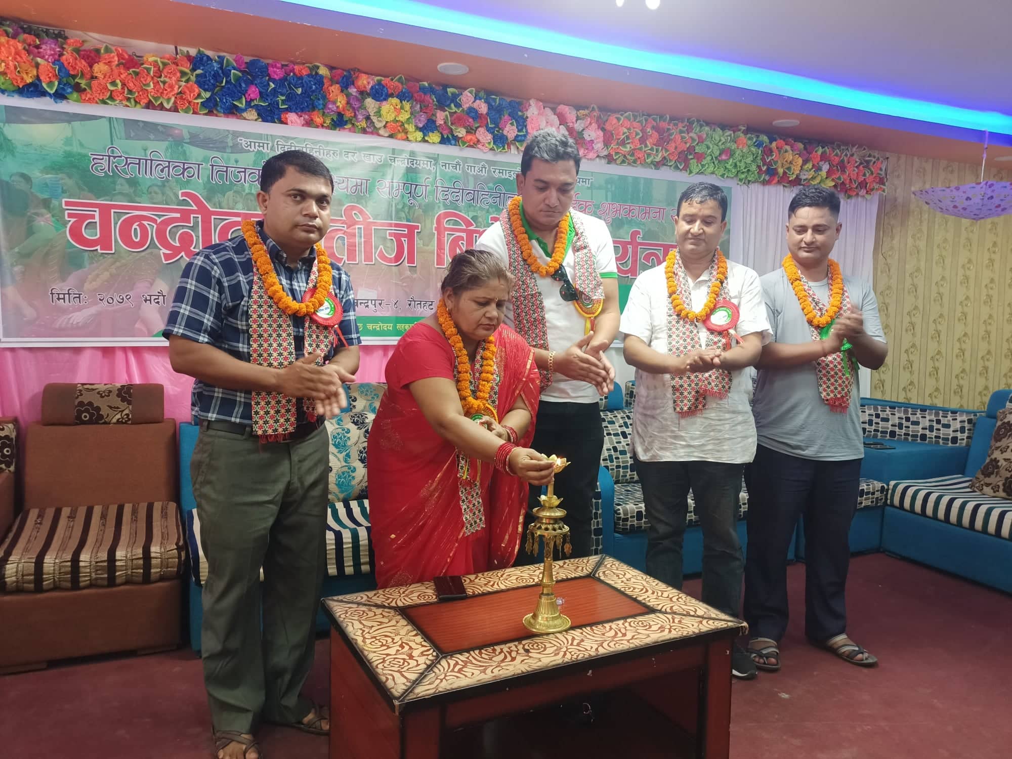 चन्द्रपुर/ रौतहटको चन्द्रपुर ४ स्थित चन्द्रोदय बचत तथा ऋण सहकारी संस्था लिमिटेडले तीज बिषेश कार्यक्रम गरेको छ । सनिबार आफ्ना महिला शेयर सदस्यहरुलाई तीजको पुर्बसन्ध्यामा मनोरञ्जन एब्म दर खुवाएर कार्यक्रम गरिएको छ । सो कार्यक्रमका प्रमुख अतिथि रौतहट बचत तथा ऋण सहकारी संघकी अध्यक्ष देबकी नेपालले समाज रुपान्तरण र सामाजिक कार्यका साथै आफनो शेयर सदस्यको जीबन उकास्न चन्द्रोदय साकोसको भुमिका सराहनीय रहेको बताउनु भयो ।