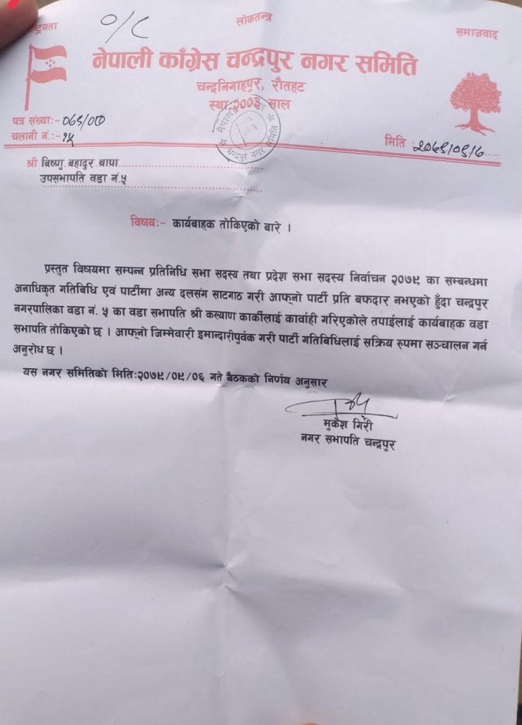 हालै सम्पन्न भएको प्रतिनिधि सभा र प्रदेश सभा (२०७९) को निर्वाचनमा अनाधिकृत गतिविधि एवं नेपाली काग्रेंस पार्टि प्रति बफादार नभएर अन्य दलहरु संग साठगाठमा संलग्न भएको भन्दै चन्द्रपुर नगरपालिका वडा नम्बर ५ का वडा सभापति कल्याण कार्कीलाई कार्वाही गरीएको नेपाली कांग्रेस चन्द्रपुर नगरका सचिव गणेश चौलागाईले जानकारी दिएका छन् । सभापति रहेका कार्कीलाई कार्वाहि गरी उपसभापति बिष्णु बहादुर थापालाई कार्यबाहक सभापतिको जिम्मेवारी दिईएको छ । नेपाली कांग्रेस चन्द्रपुर नगरपालिका समितिको २०७९ पौष ६ गते बसेको बैठकको निर्णयले सभापति रहेका कार्कीलाई कार्वाही गरी उपसभापति थापालाई कार्यवाहक सभापतिमा न्युक्त गरिएको हो ।नव न्युक्त कार्यवाहक सभापति थापालाई पार्टिप्रति आफ्नो जिम्मेवारी ईमान्दारीपुर्वक गरी पार्टिको गतिबिधिलाई सक्रियरुपमा संञ्चालन गर्न चन्द्रपुर नगरका नगर सभापति मुकेश गिरीले अनुरोध गरेका छन् ।
