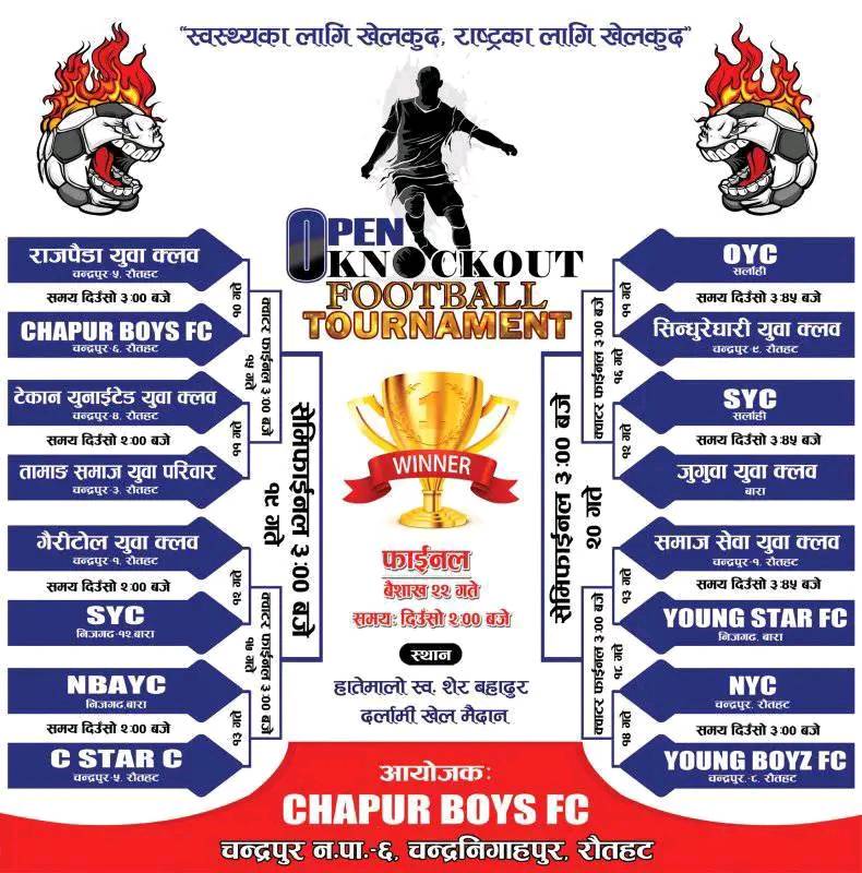 चन्द्रपुरः चन्द्रपुर नगरपालिकामा आइतबार(आज)बाट ओपन नकआउट फुटबल प्रतियोगीता हुने भएको छ । चन्द्रपुर ६ स्थित हातेमालो स्व.शेरबहादुर खेल मैदानमा ओपन नकआउट फुटबल प्रतियोगीता आज देखी सूरु हुने भएको हो । चपुर ब्वाईज एफ.सि को आयोजनामा हुन लागेको प्रतियोगीतामा १६ वटा टिमको सहभागिता रहेको छ । प्रतियोगीतामा प्रथम हुने क्लबलाई नगद तिस हजार र ट्रफिको ब्यवस्था गरीएको छ भने दोश्रो हुनेलाई पन्ध्र हजार सहित ट्रफिको ब्यवस्था गरीको आयोजकका छिरिछ लोपचनले जानकारी दिएको छन । प्रतियोगीताको सम्पुर्ण तयारी पुरा भैसकेको उनले बताए ।