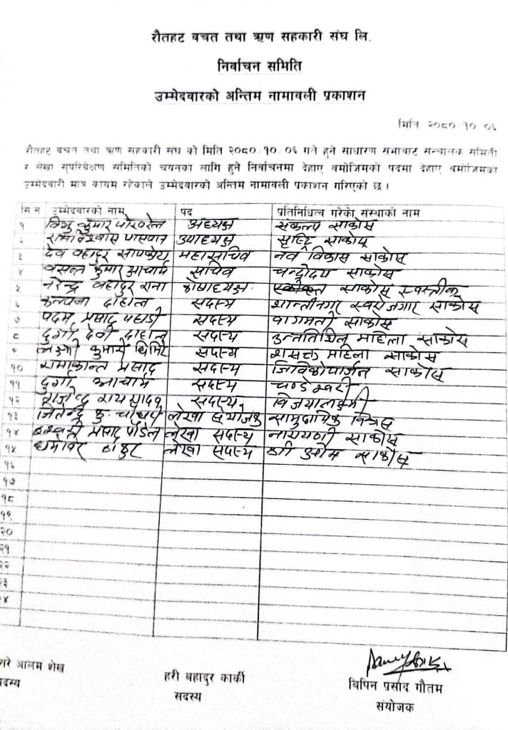यसैगरी समितिको उपाध्यक्षमा सृष्टि साकोसका राम विश्वास पासवान,महासचिबमा नब बिकाश साकोसका देब बहादुर सापकोटा,कोषाध्यक्षमा स्वस्तीक साकोसका नरेन्द्र राना चयन भएका छन । यसैगरी सदस्यहरुमा कल्पना दाहाल,पदम प्रसाद पहाडी,दुर्गा देबी दाहाल,लक्ष्मी कुमारी घिमिरे,रामाकान्त प्रसाद,दुर्गा आचार्य,राजेन्द्र राय यादब चयन भएका छन । यस्तै लेखा समितिको संयोजकमा जितेन्द्र चौधरी,सदस्यमा इश्वरी प्रसाद पौडेल र धर्मबिर ठाकुर चयन भएको निर्वाचन संयोजक बिपिन प्रसाद गौतमले जानकारी दिएका छन।